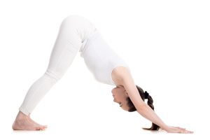 - Adho Mukha Svanasana (Downward Facing Dog Pose): Exhale and lift the hips and the tailbone up to bring the body into an inverted ‘V’ pose.